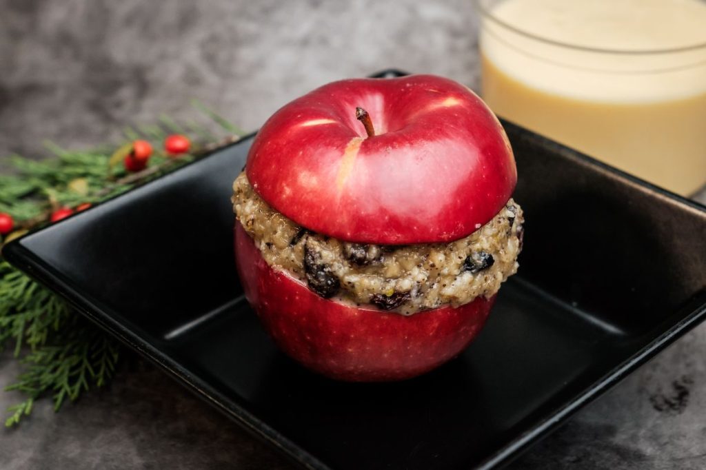 • Aranymazsolás-aszalt gyümölcsös-mézes dióval töltött alma (nyers, otthon sütős), vaníliamártással (V) 350ml 2.590,-