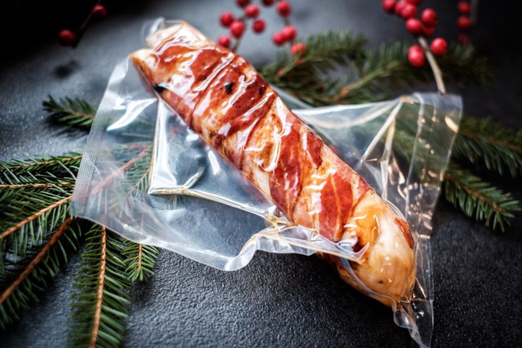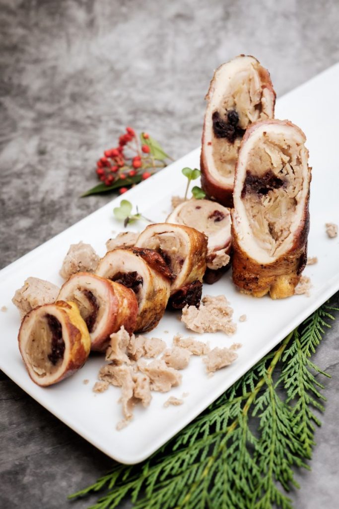 • Gesztenyével töltött – elősütött csirkemell tekercs baconben, vákuumozva 2 db (GM) 300g 4.490,-