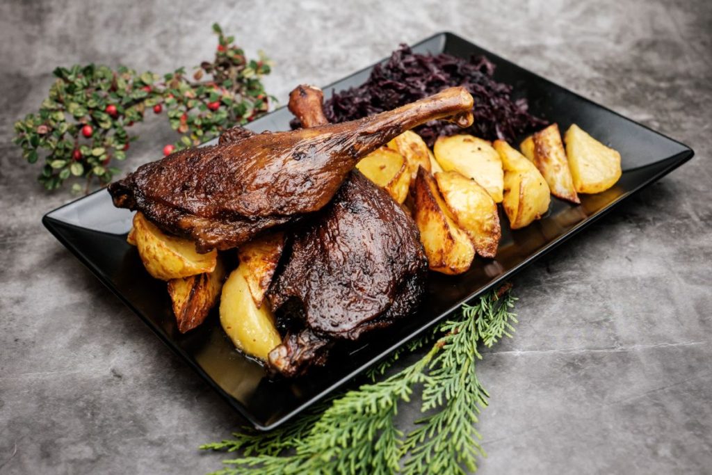 • Hagyományos sült kacsacomb (GM, TM) 2×200g párolt lilakáposztával, tepsis burgonyával 5.990,-