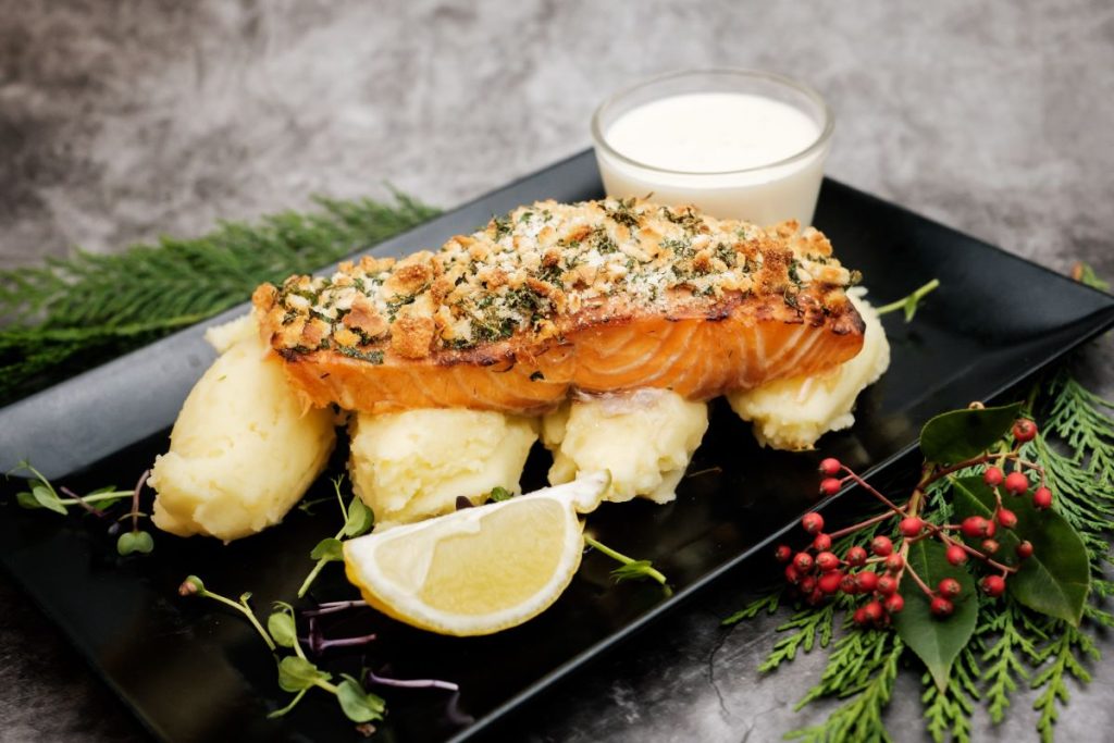 • Lazac steak parmezános panko crustával 200g , citromos krémszósszal, burgonyapürével 6.990,-