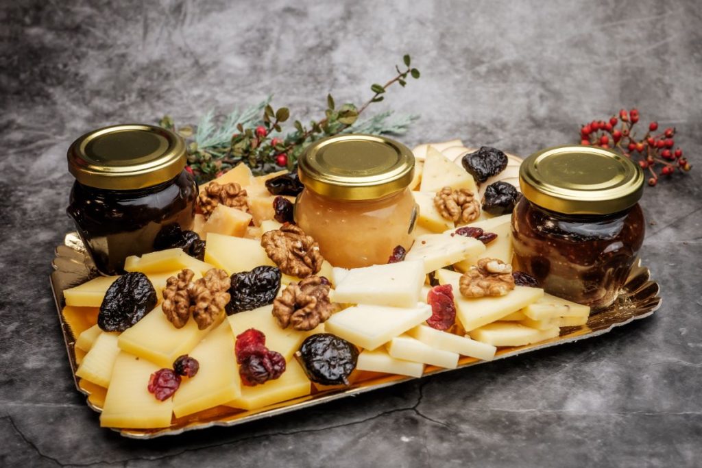 • UMAMI vendégváró sajttál (mustármagos, szegfűszeges, szarvasgombás, sópelyhes, massdamer, manchego, füstölt) 500g, házi készítésű chilis szilva chutney-val, füge- és birslekvárral, aszalt szilvával és olajos magvakkal (GM, V) 14.990,-
