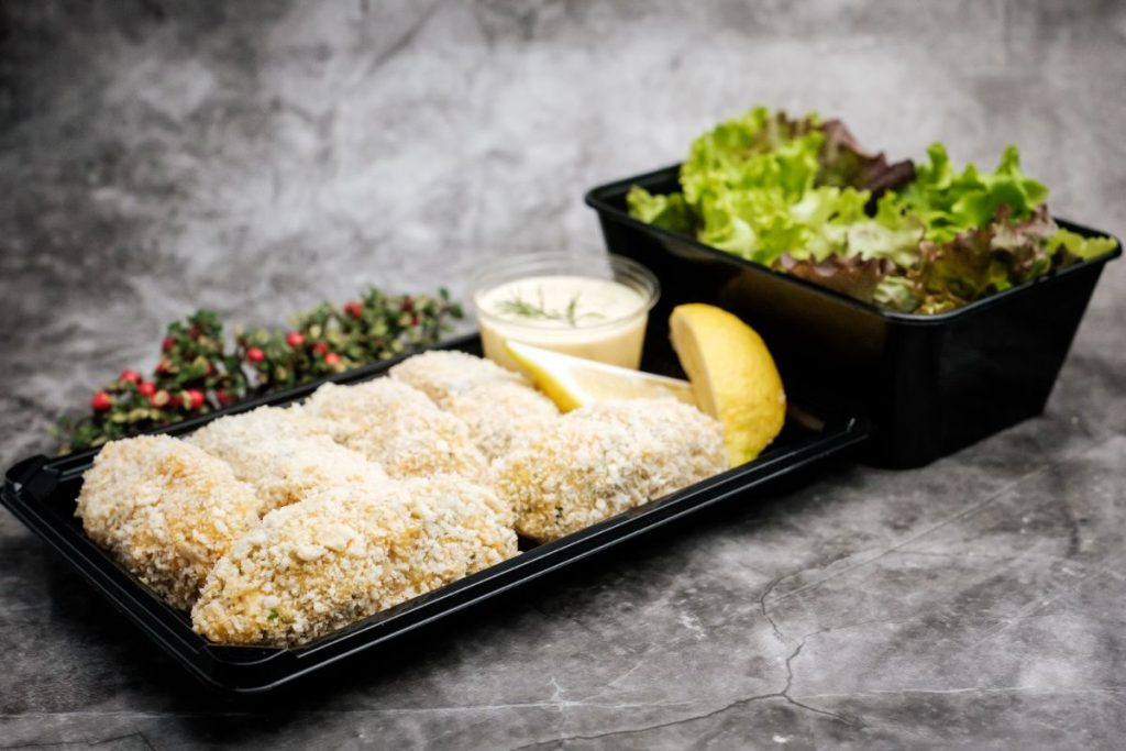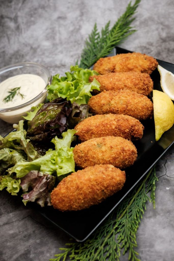 • Zöldfűszeres-chilis tőkehal-krokett (6 db) 500g, kapros majonézzel, salátával és citromdresszinggel 6.990,-
