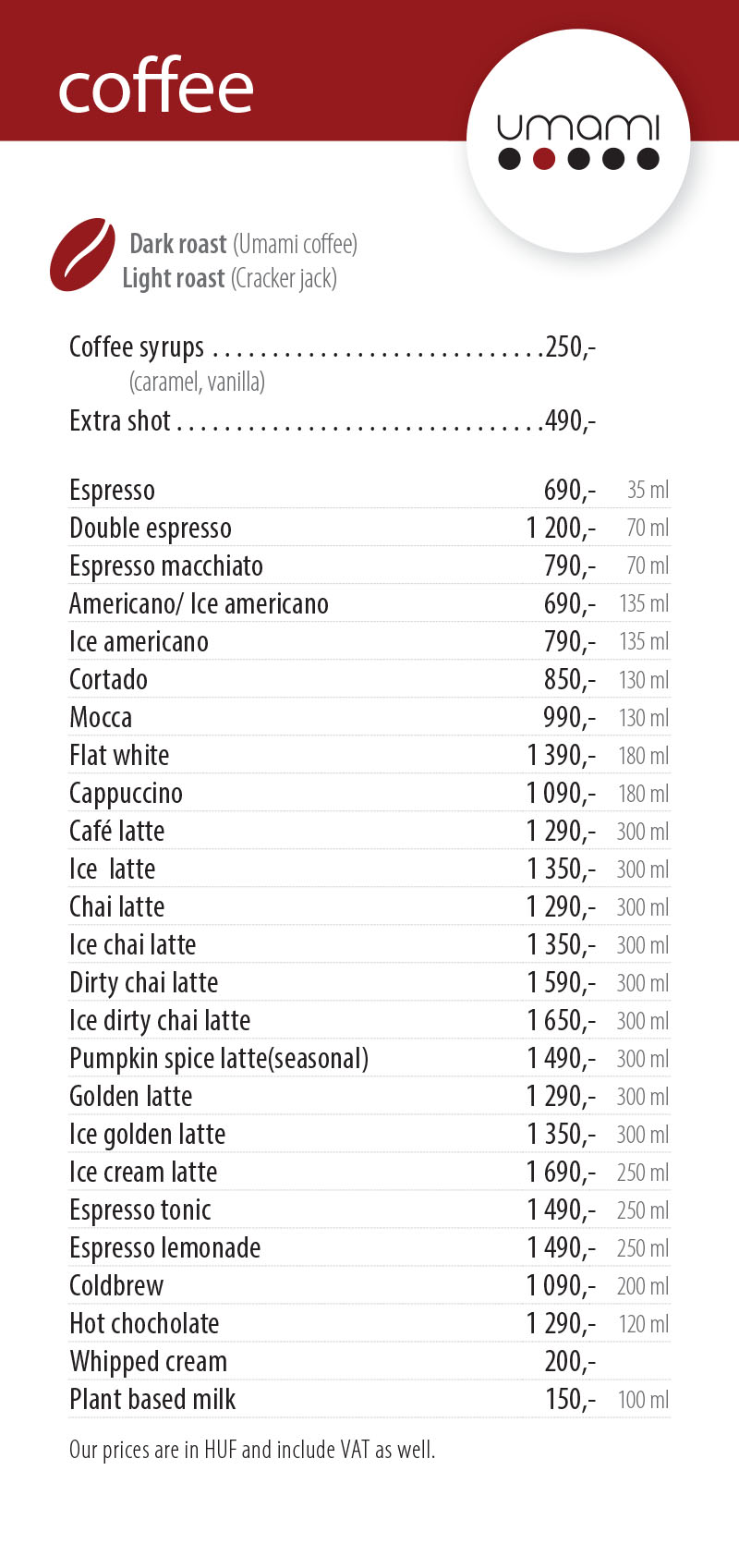 Reggel hétkor nyitunk, az egész délelőttöt pedig a kávéillatú nyüzsgés jellemzi. Itt és innen indul a nap, mi pedig kellő muníciót szeretnénk adni mindenkinek, hogy ezek a dolgos hétköznapok sikeresek legyenek. A helyiség hangulata, kollégáink mosolya, egy-egy jó szó vagy biztatás az a bizonyos plusz, ami a baristánk keze közül kijövő kávé mellett az Umami feelinget adja.